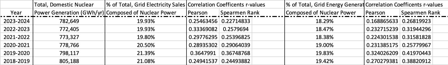 It’s logical to assume that such parallel and consistent, YoY population sets would yield very similar correlation coefficients; regardless of whether the data was normally distributed, or converted into ordinal rankings. But that doesn’t appear to be the case; especially as it relates to the % of total power generation: there is a progressive improvement in nuclear power, and its congruency with declining grid prices over time.